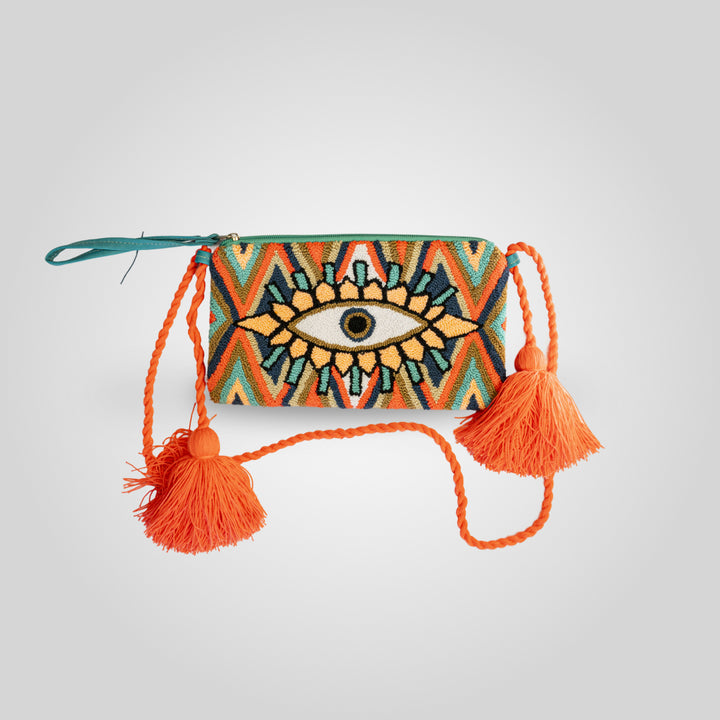Los sobre tapizados Wayuu con un ojo tejido son una manifestación artística y cultural de la comunidad indígena Wayuu. Estas piezas, utilizadas como cosmetiqueras o bolsos para guardar el celular, destacan por su diseño único y su profundo significado simbólico.