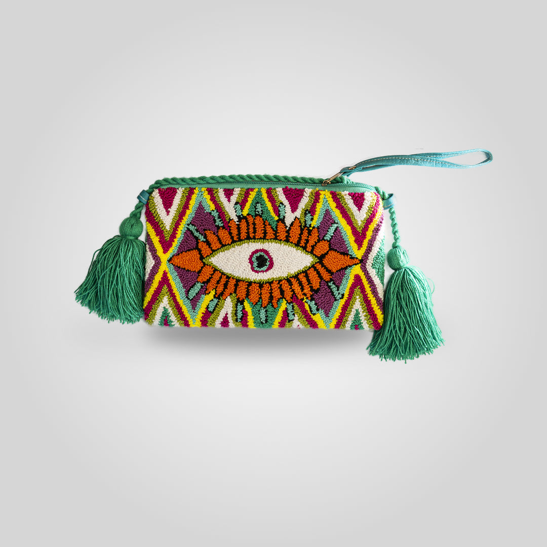 Los sobre tapizados Wayuu con un ojo tejido son una manifestación artística y cultural de la comunidad indígena Wayuu. Estas piezas, utilizadas como cosmetiqueras o bolsos para guardar el celular, destacan por su diseño único y su profundo significado simbólico.